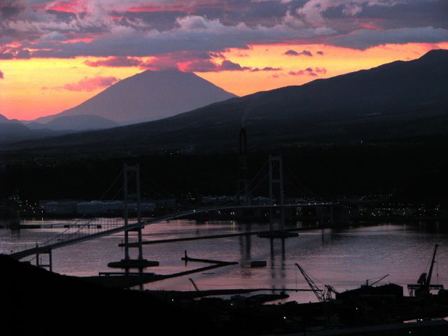 「室蘭の半島側から見た(つまり正面のつり橋の右手が室蘭港)羊蹄山」 です。