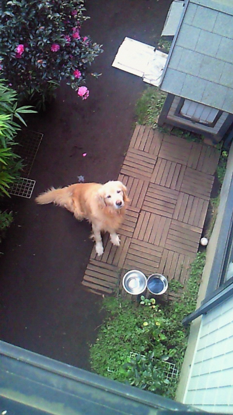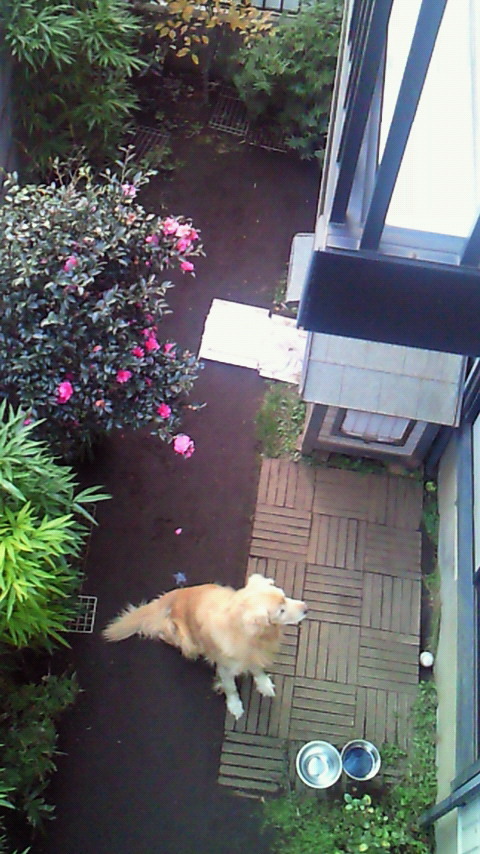 ラッキーも風が吹いてるのに、小屋を出て庭から家の中を眺めています。