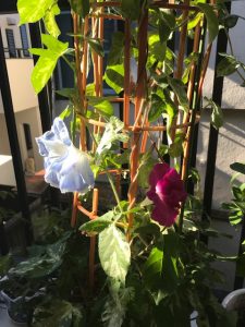 優しいお客様から今年もいただいた朝顔が、青・赤の綺麗な花を1輪ずつ咲かせてくれました。