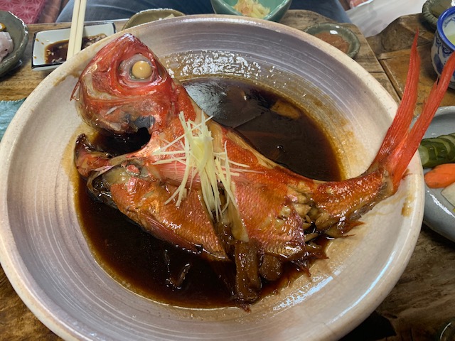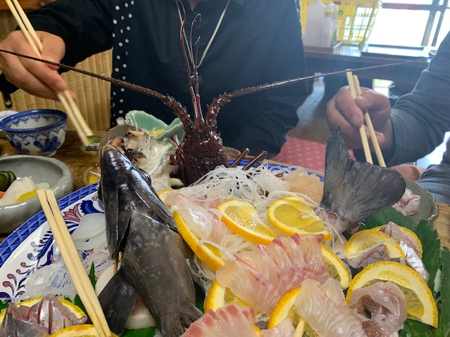 昼食に訪れた赤沢丸昌の生き作りも金目鯛の煮付もお椀も絶品!