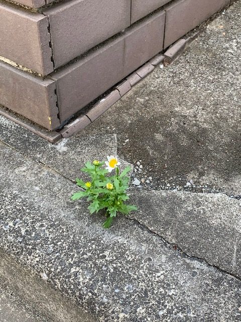 花壇の下のコンクリートの隙間から咲いているノースポール。